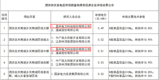 晶科电力中标泗洪二个应用领跑项目共200兆瓦