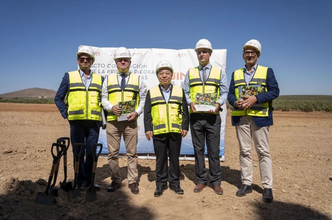 在奠基仪式上,叶建春省长、安达卢西亚大区工业代表卡洛斯·加西亚·吉梅内斯、晶科科技副总裁睿维等持握铁锹为项目奠基石培土。并按照当地传统,将装有当天报纸和硬币的盒子埋入项目工程现场。